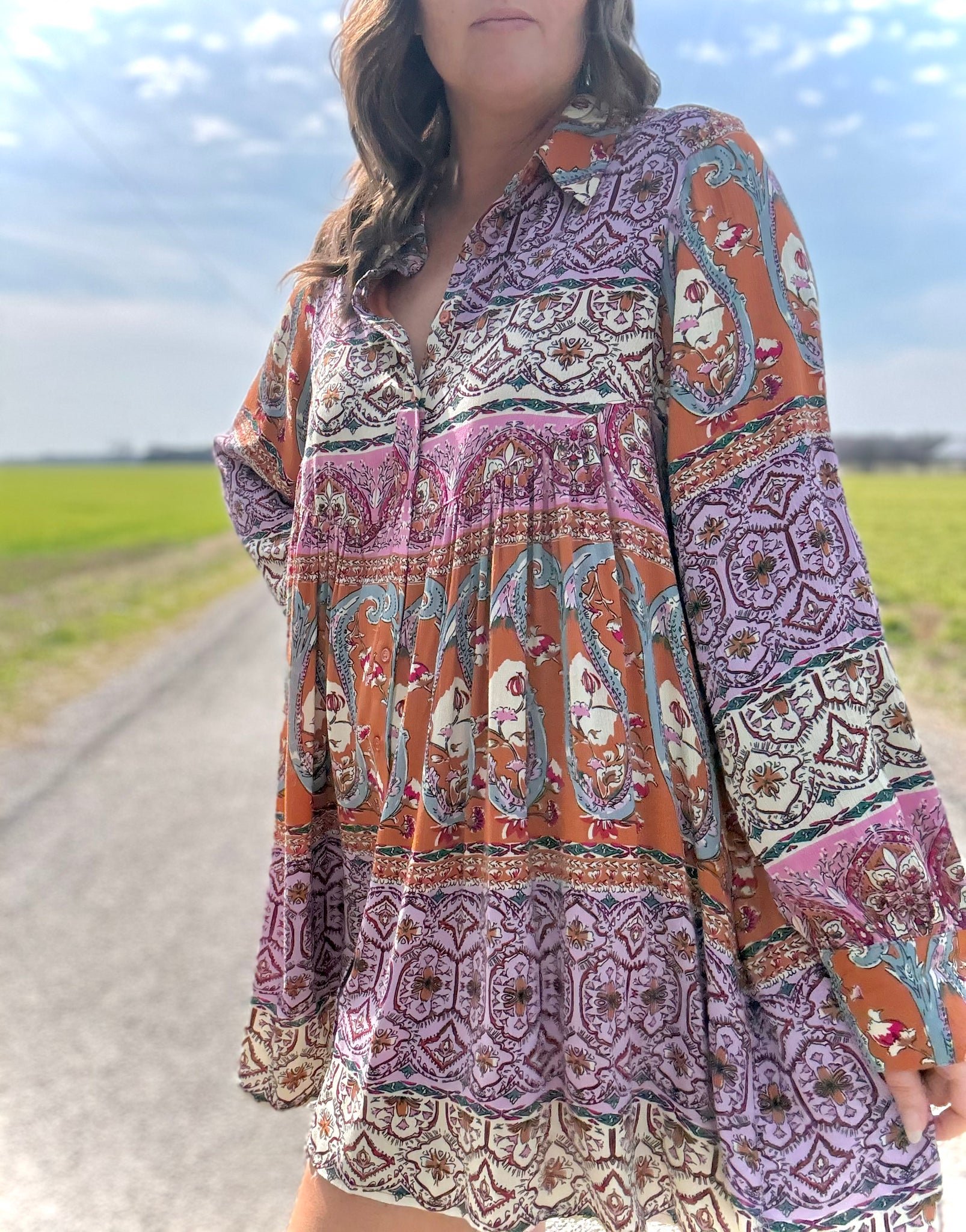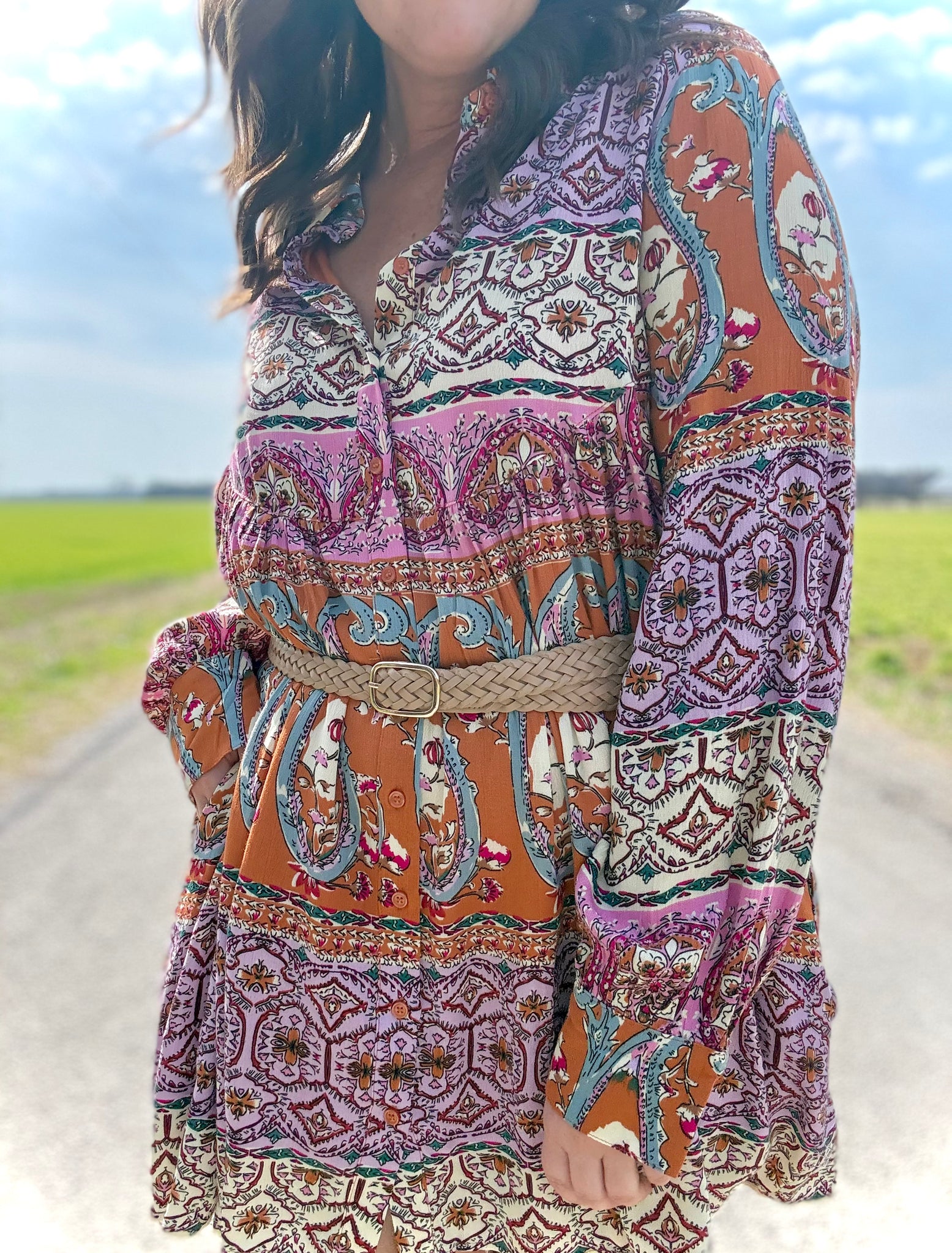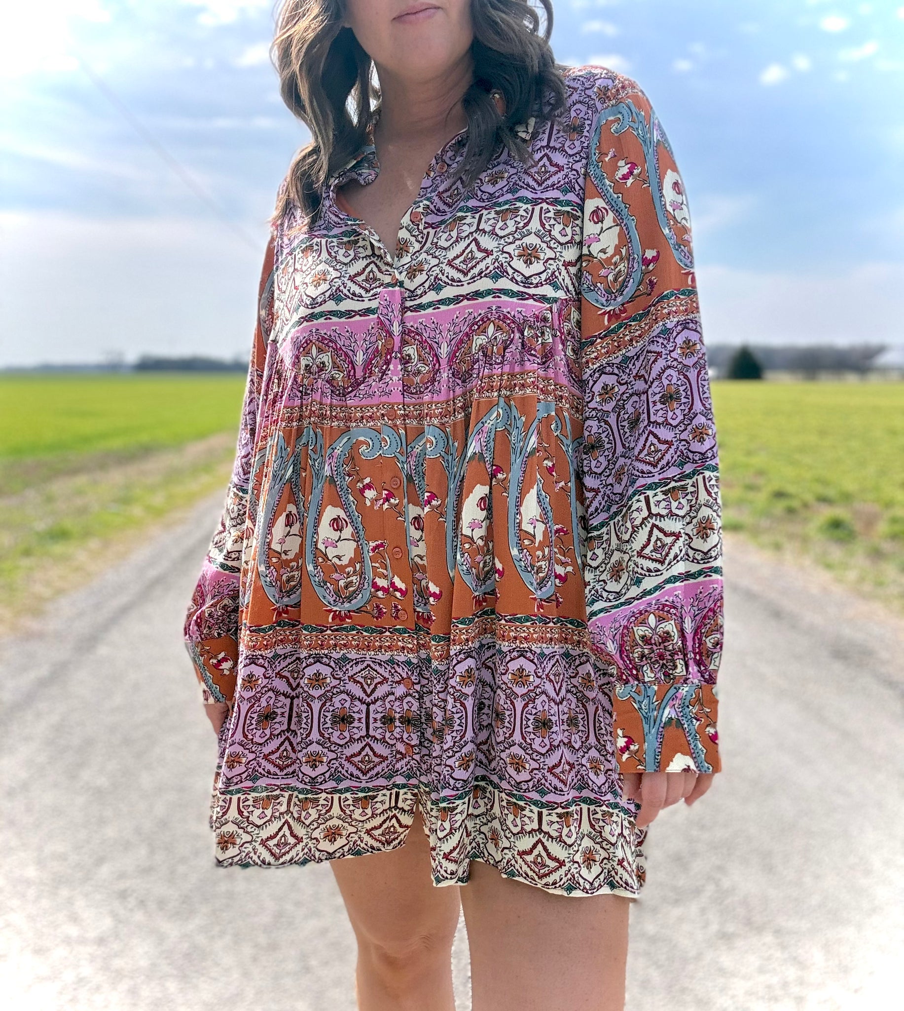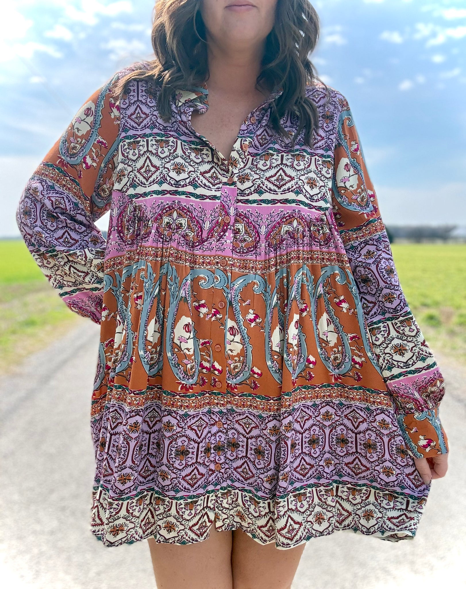 Nothing says "a new season is here!" quite like a piece that combines elegance with practicality. This dress showcases an intricate paisley pattern, adding a punch of color with bohemian flair in orange, magenta, cream, lavender, teal, and pale blue. Favorite features include a classic buttondown front, tailored collar and cuffs for a polished appearance, with functional side pockets, and a lined yet lightweight bodice. Style this piece with heels for a formal occasion or pair with sneakers for a casual day out!