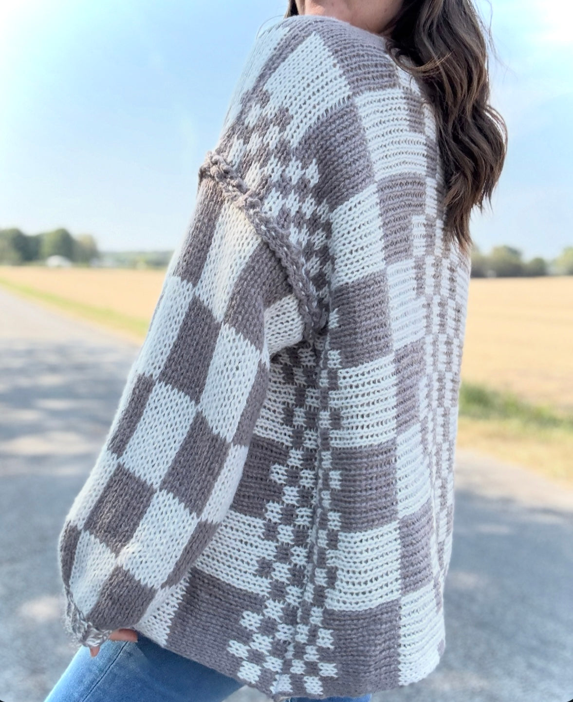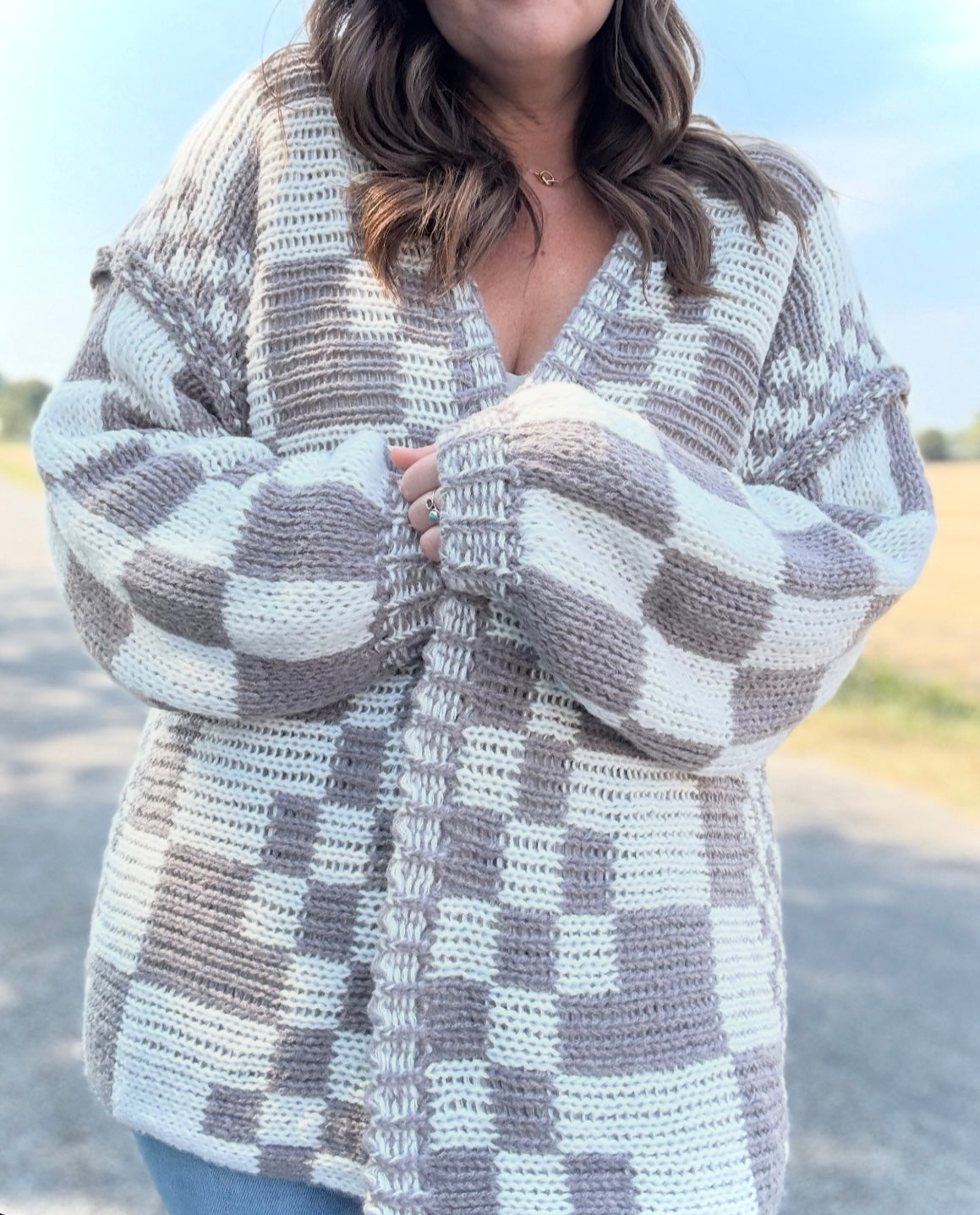 Bonfires, snow days, ball games, and beyond- this oversized cardigan acts as a chic blanket you can wear for all of your fall/winter festivities! When the temps begin to really drop, pack this chunky knit to dress-up or wrap-up in. Attributes include an oversized, boxy cut with drop-shoulders, bubble sleeves, wide band at wrist & lapel for added detail, and a greige & white checkered pattern. Size up for the ultimate blanket feel!