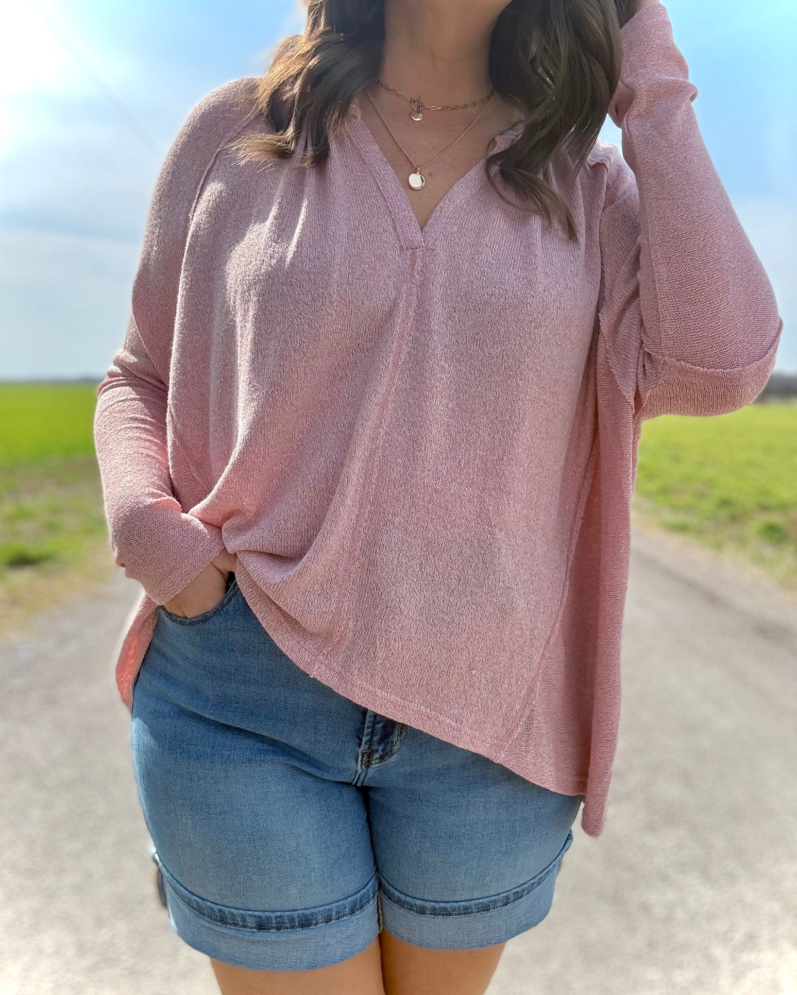 Who doesn't love a top that can go from the gym, to the grocery, to date night?! The Rosey top is the perfect addition to your capsule/travel wardrobe with its versatility and lightweight Spring vibe. Features include its oversized dolman-style bodice, plunging V-neckline with banded collar, fitted long sleeves from the elbow down, extended yoke in back for detail and comfort, and an overlapped slit down the back for added movement, all in a beautiful blushing pink tone.