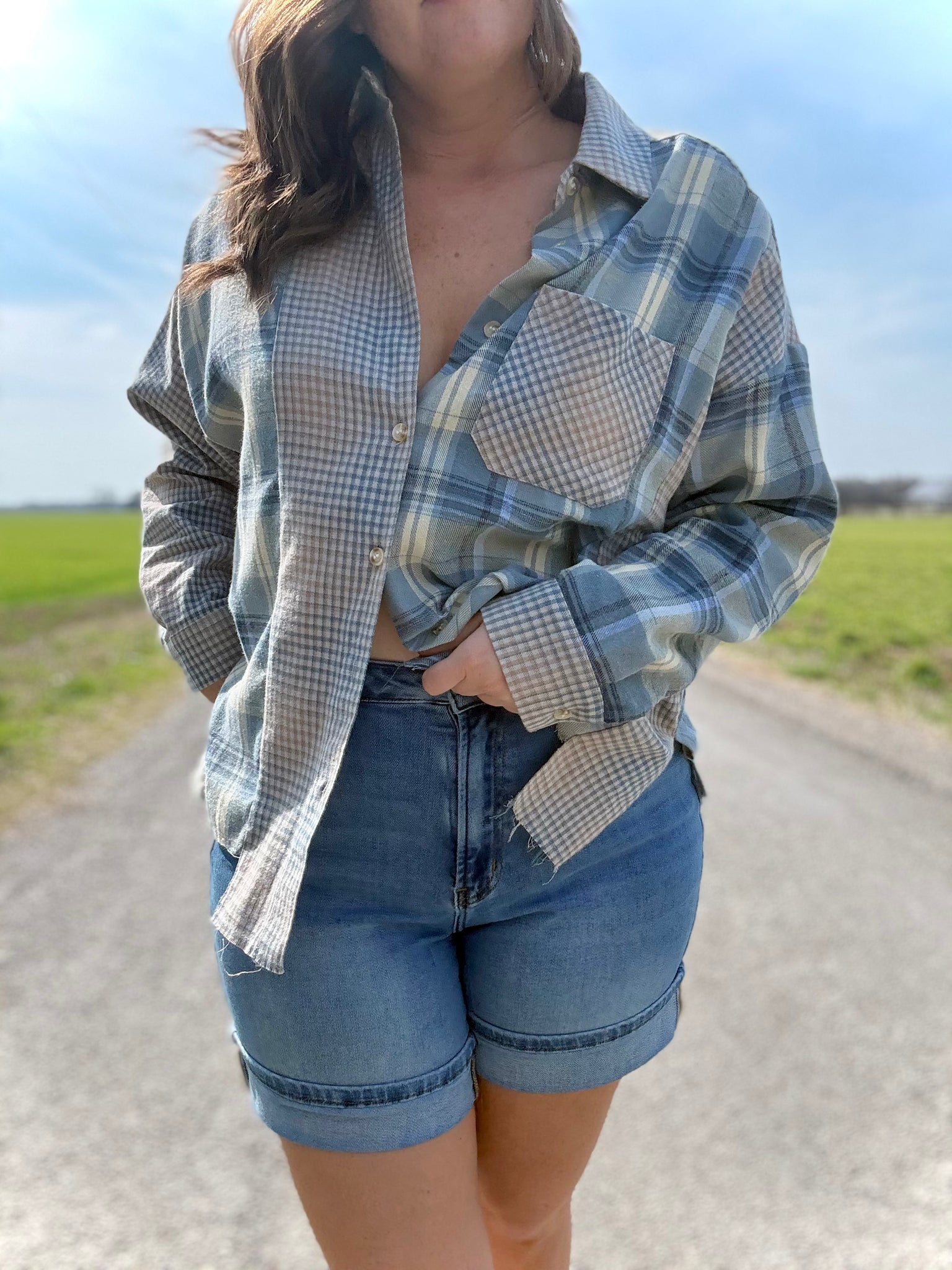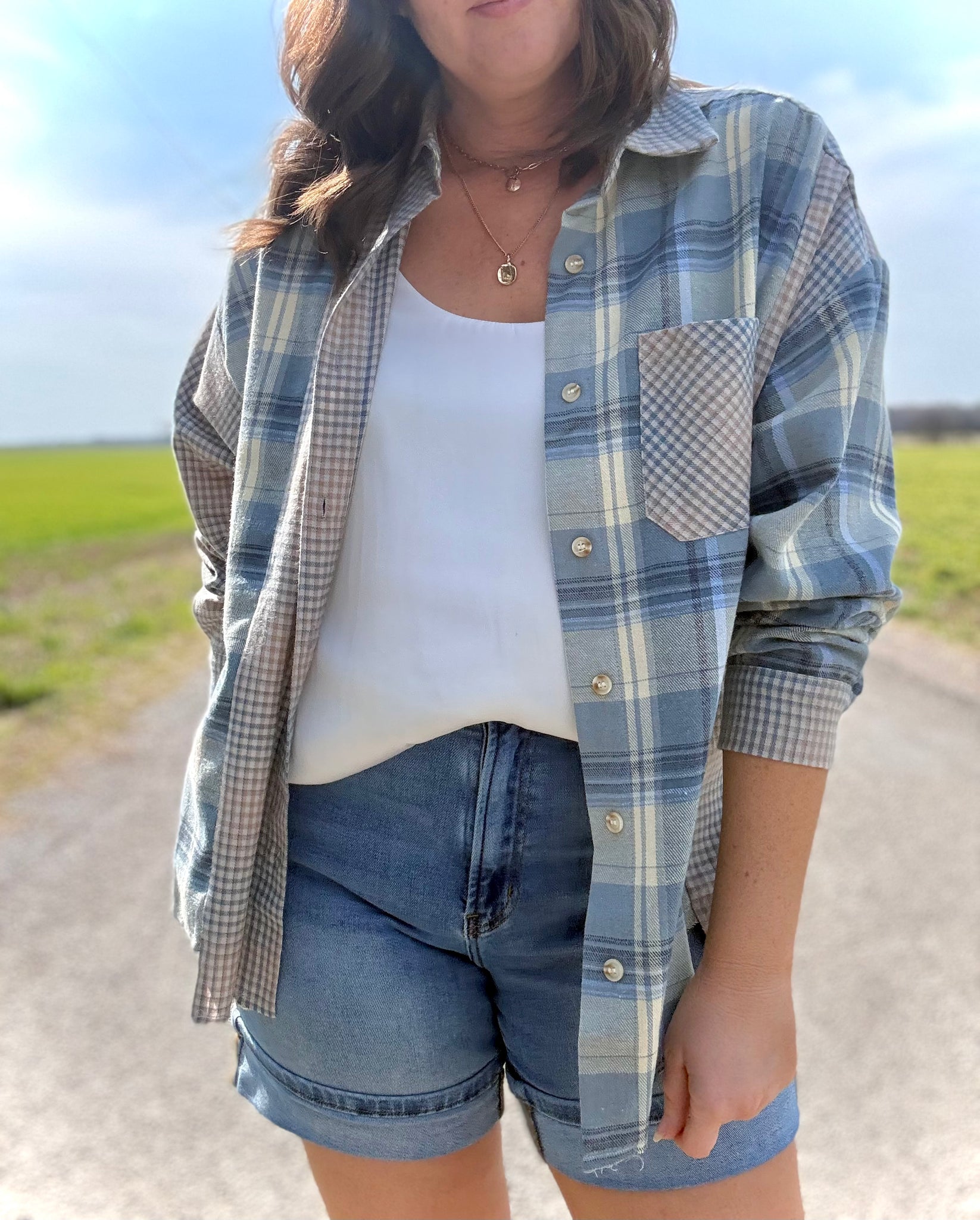 A flannel for all seasons, this button-down shirt featuring a chambray and cream plaid print and patchwork contrast makes getting dressed a breeze. It has a classic collared neckline and single chest pocket, with a slouchy, relaxed fit, and includes drop-shoulder sleeves with cuffs and raw trim hemline for a casual/worn look.