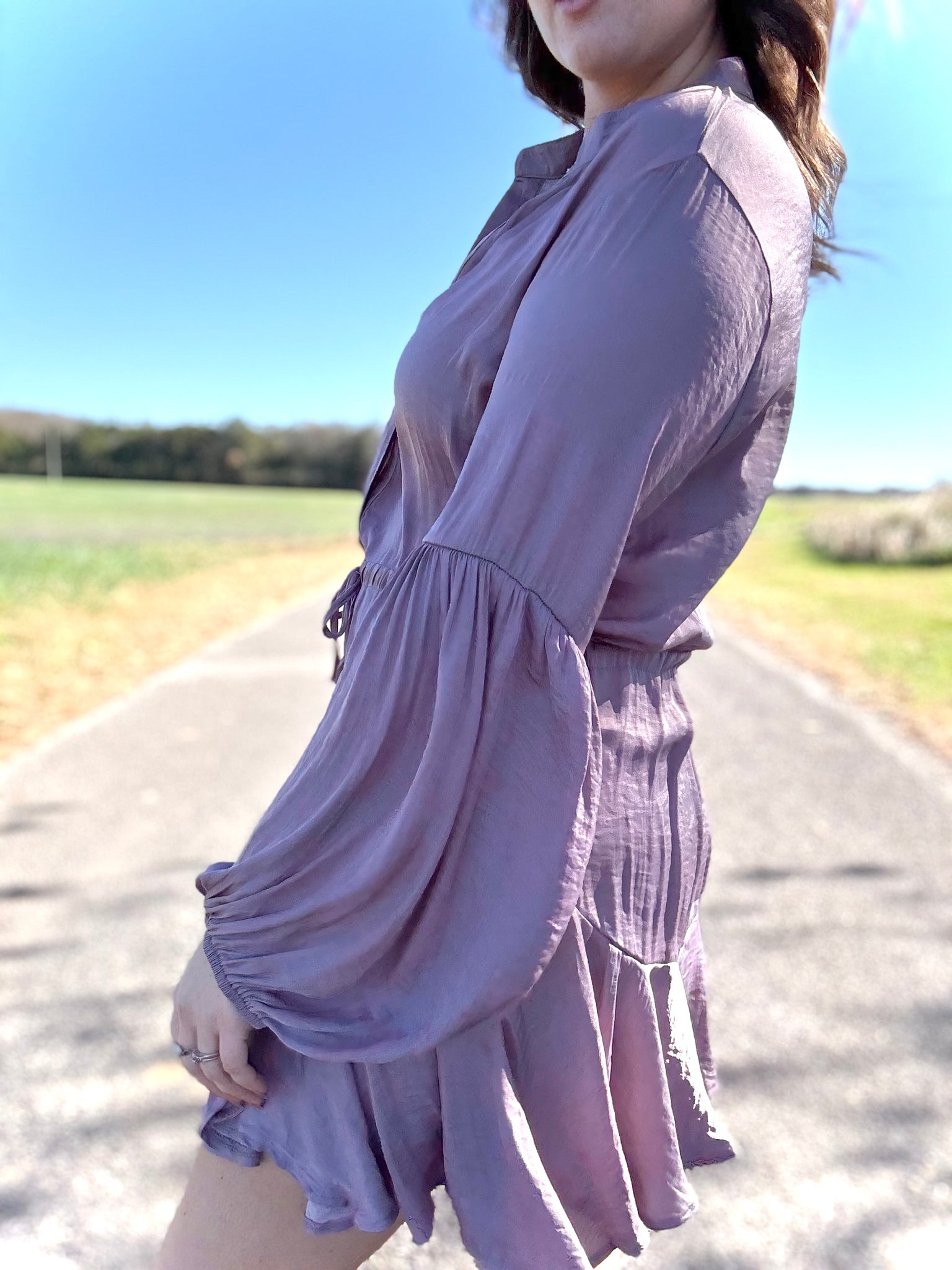 Shimmer this season in the Satin Sugar Maple Dress✨Lightweight, flowy, and feminine, this dress/tunic pairs well with knee-high boots, tights, or stands alone with heels for a formal event. Features include V-neckline, balloon-style sleeve with elastic at wrists, drop-waist & drawstring, and tiers of flounce skirt for movement, all in a muted violet tone.