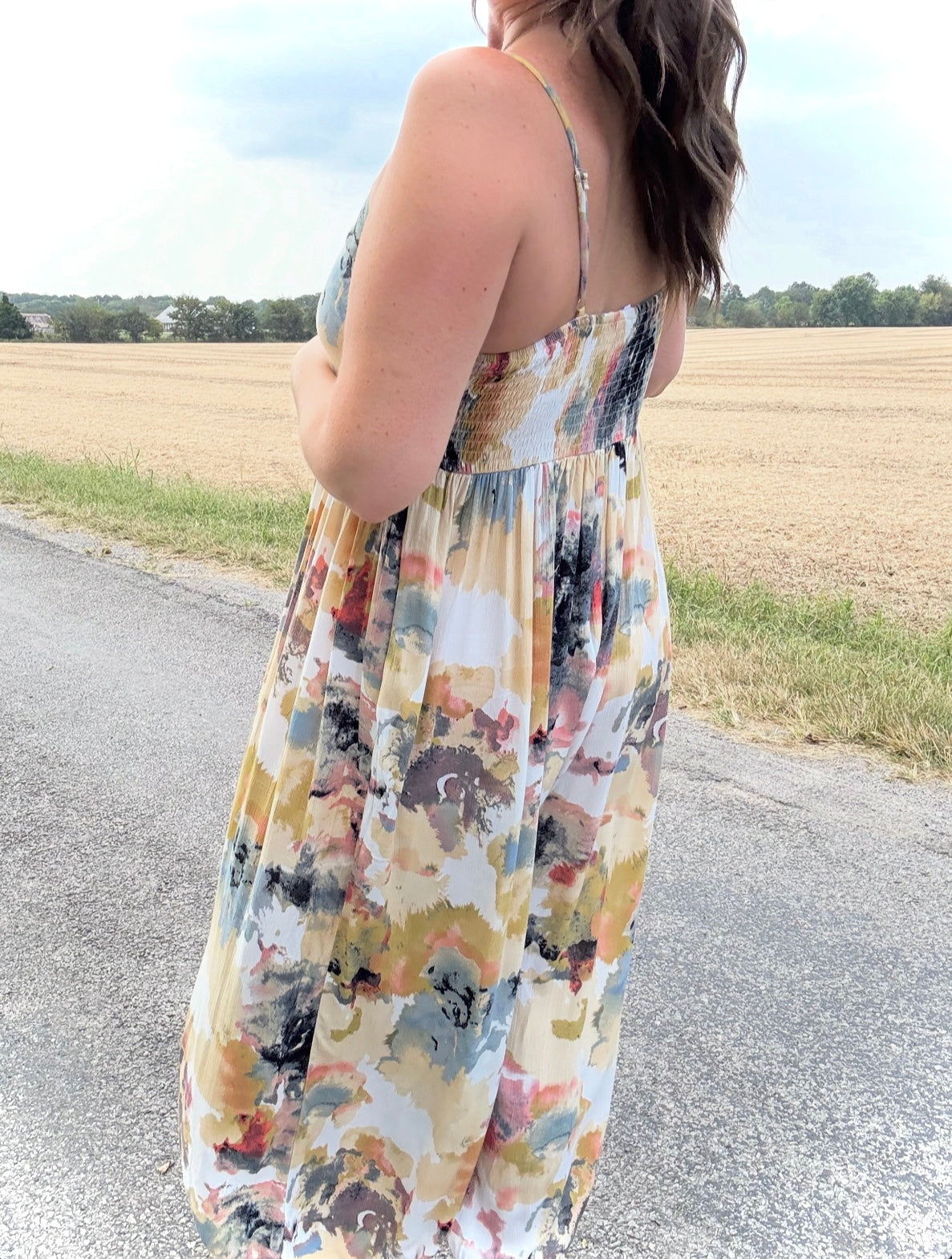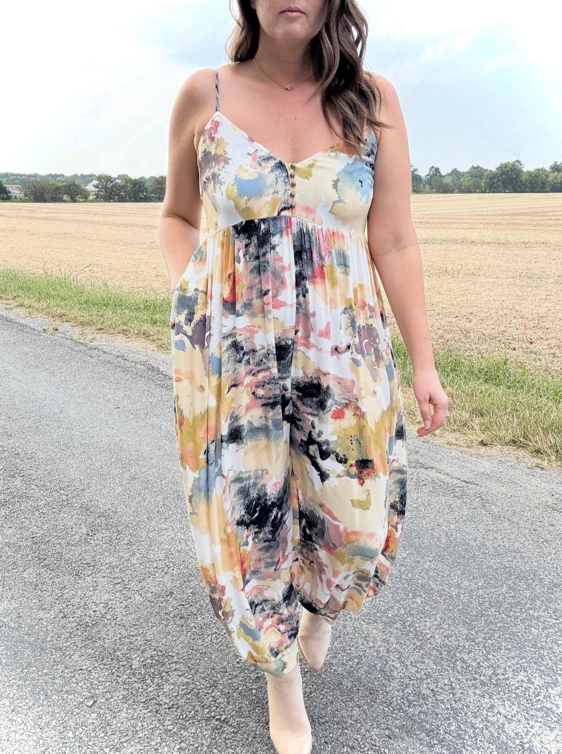 With seasons shifting, this jumpsuit will keep you comfy and covered for any occasion with a bold tie-dye mix of warm & cool tones. Dress it up with heels & a denim jacket for date night, or wear it oceanside with sandals & a sun hat. Features include adjustable skinny straps, smocked upper back section for comfort, brass-colored buttons down the bust, empire waistline, and parachute-style wide legs with a cuff at the ankle for a tailored touch. Oh, and it has POCKETS!